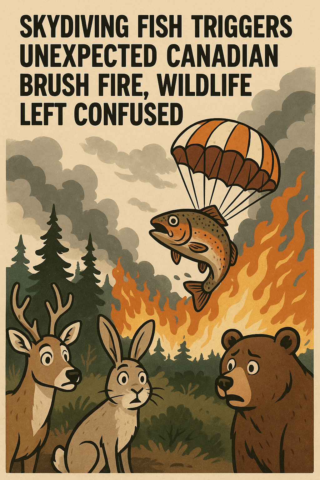 In a development that could only make sense to a weather forecaster with a head injury, citizens of Maple Moose County, Canada, were left flabbergasted yesterday after a sky-falling fish reportedly ignited a brush fire, sparking both flames and existential questions.